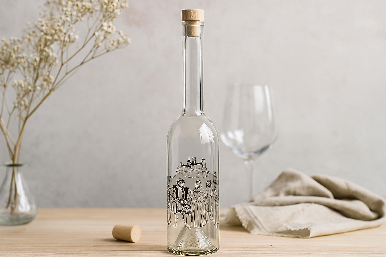 Glāzes un pudeles 350 ml stikla pudele 'Opera', motīvs: mūzikas notis, atvere: korķis